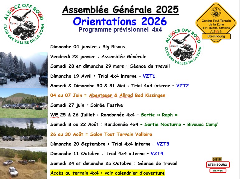 Rare est le week-end ou il n'y a pas un minimum d'activité. Outre le programme officiel d'activité du Club, de par sa vocation a accueillir tout possesseur de véhicule 4x4, le Centre Tout Terrain de la Zorn est très souvent animé. L'accueil de groupe ou clubs étrangers assurant une animation quasi continue. Ainsi, il est possible d'observer des véhicules classiques, de série et d'y découvrir ou d'y surprendre des engins plus extraordinaires ou d'exception !